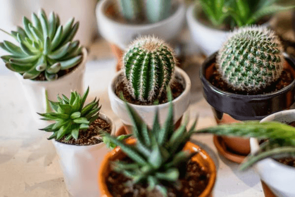 Espacios pequeños: Plantas compactas como las violetas africanas o los mini cactus son ideales para estanterías, escritorios y mesas pequeñas.